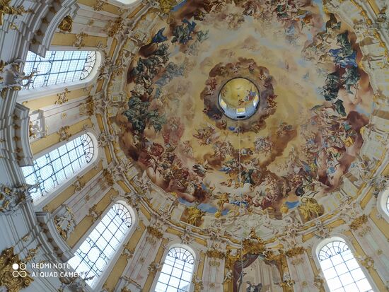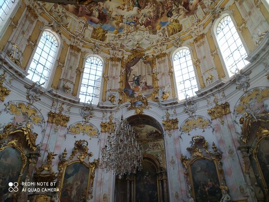 1744 - nach einem Großbrand und Zerstörung von Kirche und Kloster - wird die Klosteranlage zu der noch heute erhaltenen Form durch Enrico Zucalli (Hofarchitekt) und dem Wessobrunner Josef Schmutzer umgestaltet. Der Zentralbau mit 12-eckigem Grundriss beeindruckt vor allem durch die herausragende Stuckdekoration von Johann Baptist Zimmermann und Johann Georg Üblherr sowie durch das Deckenfresko, das den benediktinischen Himmel und seine Hauptheiligen unter der Dreifaltigkeit thematisiert.