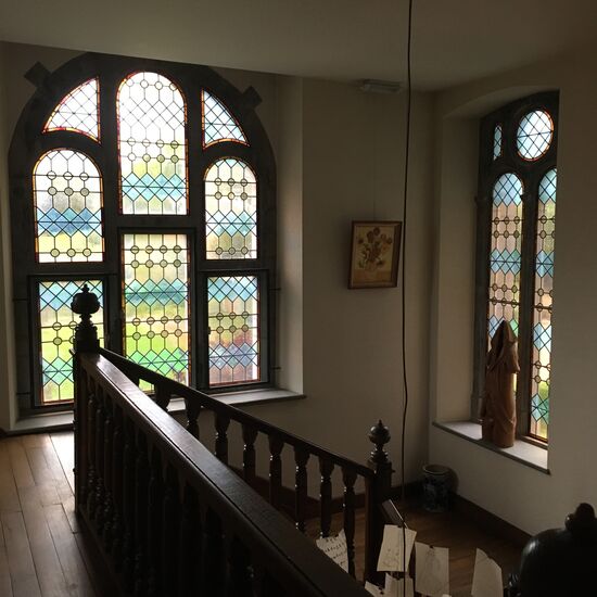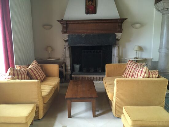 Neben der Rezeption steht eine Couchgarnitur vor einem Kamin, das Treppenhaus ist imposant, ansonsten ist der nebenanliegende Saal verwaist.