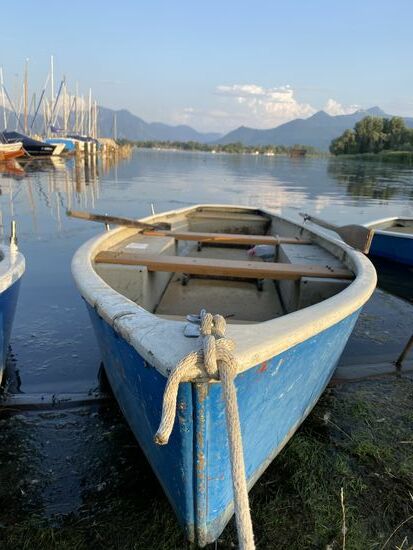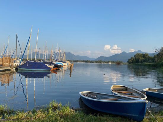 Nun ist es soweit! Die Nervosität hat mir gerade 2 Stunden Schlaf gegönnt und um kurz nach 4 heute Morgen ging es los! Bis Aschaffenburg lief alles super, und dann Stillstand! Autobahnsperrung aufgrund von Bergung… 2 1/2 Stunden tat sich gar nichts… und als es dann weiterging, kam man von einem Stau in den anderen… bis in den Abend hinein waren die Staunachrichten sehr lang… um 17.00 Uhr war ich endlich in Prien am Chiemsee und bin so froh, für eine Nacht einen Platz zu haben, denn rund um den See ist wohl alles voll belegt… ! 32 Grad zeigt das Thermometer, eigentlich Sommer, aber dieses Jahr ist man es nicht so wirklich gewöhnt! Also schnell das notwendigste aufgebaut und dann ab zum See…