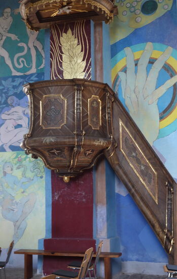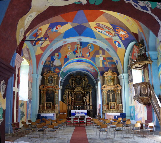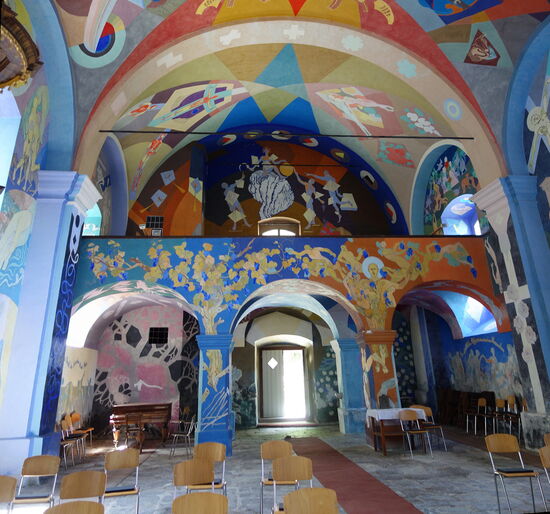Das von außen recht unscheinbare Gebäude birgt innen eine avangardistische Ausmalung