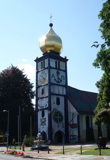 Die Nachkriegskirche wurde 1948 1950 nach den Plänen von Architekt Lebwohl errichtet. 1987 erfolgte die (Neugestaltung der Gebäudehülle unter Friedensreich Hundertwasser.