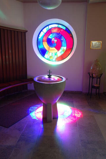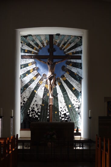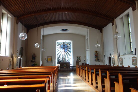 Im Kircheninnenraum sind mehrere Arbeiten heimischer Künstler aus der Gestehungszeit und der Umgestaltung vorzufinden.