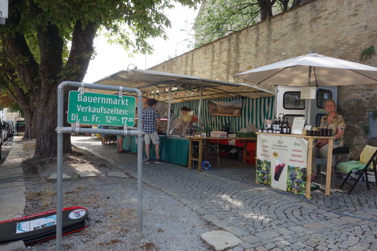 An der Stadtmauer findet regelmäßig der Bauernmarkt statt.