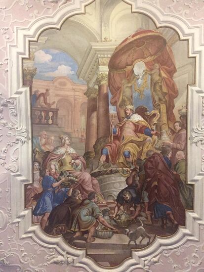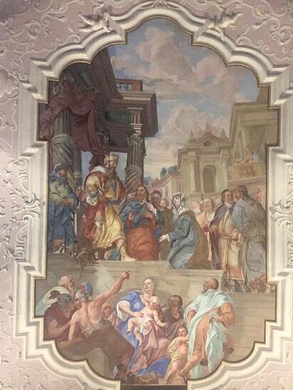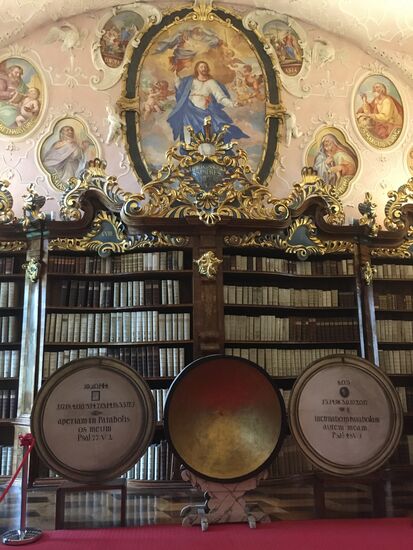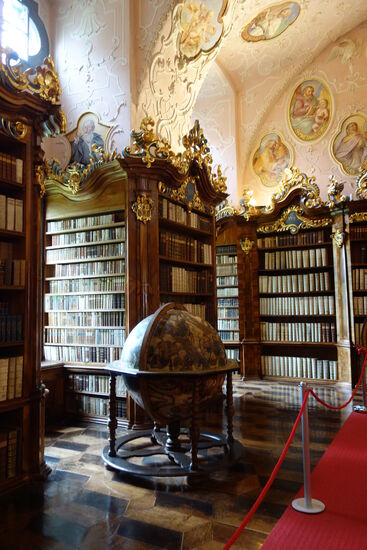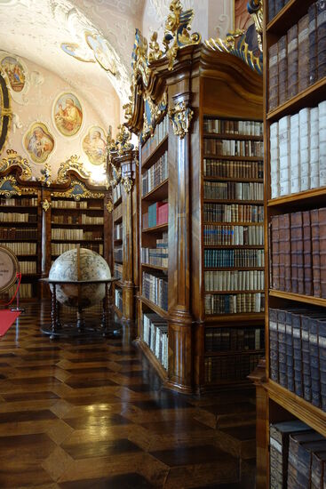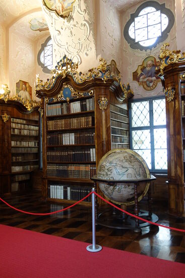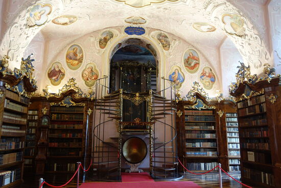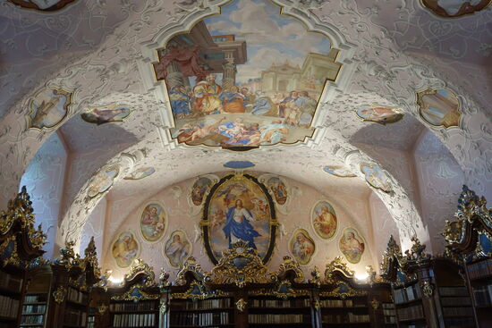 Sie ist im Prälaturtrakt untergebracht und beherbergt rund 17.500 Bände, die hauptsächlich die Wissenszweige Philosophie, Theologie und Rechtswissenschaft umfassen. Dies wird durch drei große Deckenfresken symbolisiert.