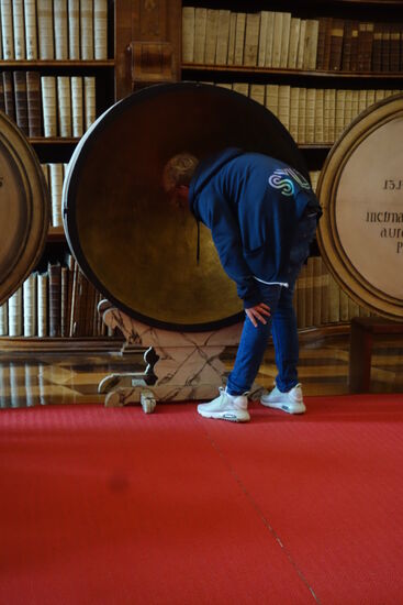 Danach macht sie darauf aufmerksam, dass zur Erhaltung der Ruhe in der Bibliothek die großen Schalen an den Kopfwänden dienen, um trotzdem miteinander zu sprechen. Einige Besucher können dies ausprobieren.