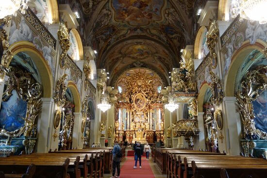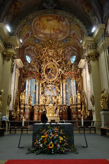 Die Stiftskirche, in den Jahren 1163-85 als dreischiffige romanische Pfeilerbasilika errichtet, wurde durch den Stiftsbrand 1237 vollständig zerstört, worauf ein Neubau im gotischen Stil erfolgte. Der vollständige Neubau der sich jetzt erhebenden dritten Stiftskirche erfolgte in den Jahren 1660-62 nach den Plänen des Schweizer Baumeisters Domenico Sciassia. Der Bilderschmuck der Stiftskirche thematisiert Jesus Christus als Erlöser der Welt. Der Hochaltar, das Glanzstück der Kirche, wurde nach Plänen von Matthias Steinl in den Jahren 1701 -04 errichtet. |