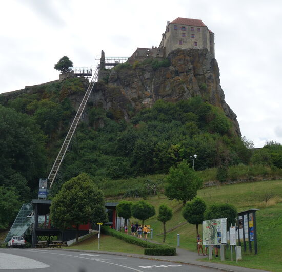 Wir kommen leider von Norden an die Burg ran und müssen mit dem Gegenlicht leben. Dafür erkennen wir sofort die 'bequeme' Möglichkeit der Burgbesichtigung: den Schrägaufzug.