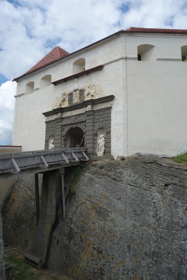 Man läuft entlang des Grabens und über die Brücke zum Eingang. Durch zwei Tore gelangt man zum Arkadenhof.