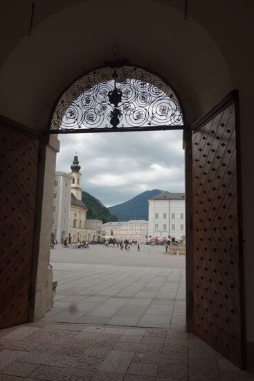 durch die für die Salzburger Festspiele bereits aufgebauten Tribünen ist die Fasssadenansicht eingeschränkt
