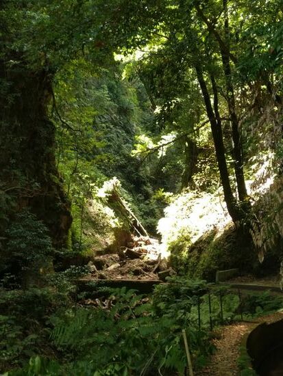 Eine Felswand mit Farn bewachsen, an dem das Wasser runterlief. Zuhause überlege ich gerade, wie man wandgebundene Fassadenbegrünung baut...