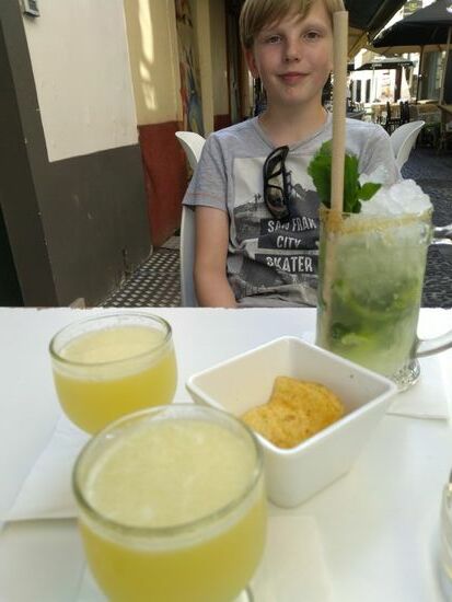 Und dann wollten wir unbedingt noch einen Poncha trinken, das traditionelle Getränk auf Madeira neben dem Wein.. Als hingesetzt und 2 Poncha bestellt, Raphael bekam einen Virgin Mojito.