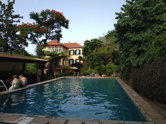 Nach einer knappen Stunde sind wir an der Nordküste in Arco de Sao Jorge angekommen, unsere Quinta Arco de Jorge lag am Weg. Von Mauern umgeben wirkte die Anlage bereits beim Hereinkommen traumhaft schön, Kleine gepflegte Häuschen in einer weiten Gartenanlage verteilt, 2 Swimming pools, ein netter Empfang, fühlt sich richtig gut an.
