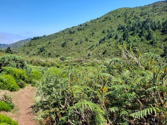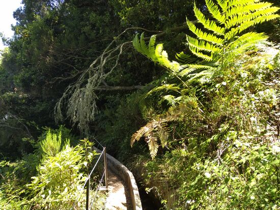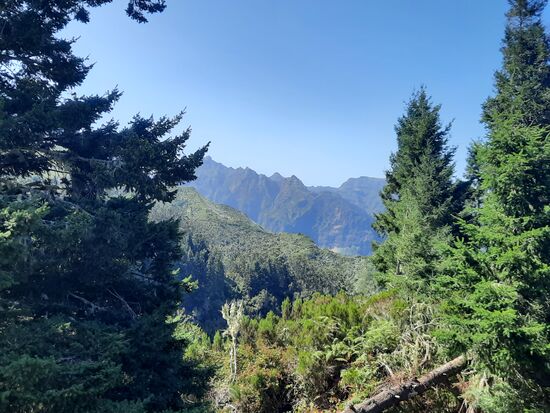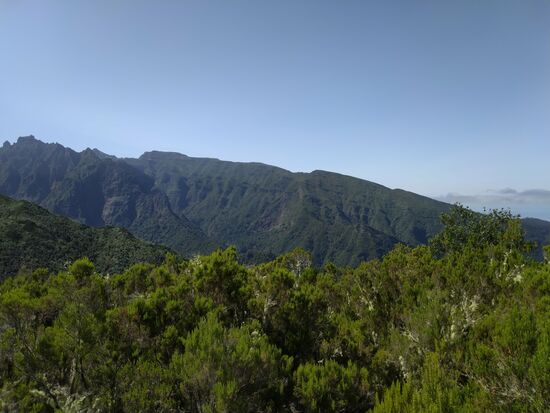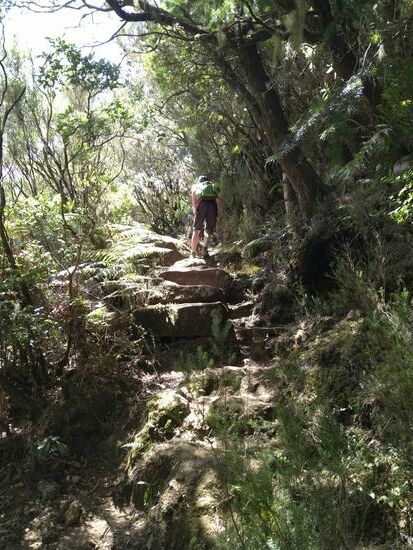 Die ersten 5-6 km waren gut ausgebauten Wander- oder Levadawege, allerhand zu schauen. Der Weg steuert verschiedene Ziele an. Gabelungen gibt es wenige. Wichtig ist, dann den Abzweig zu nehmen, auf dem ein 35-km-Trail ausgewiesen ist. Irgendwann mussten die Höhenmeter ja kommen, jetzt aber gleich geballt, 2.5 km steil bergan, teils ein bisschen mit Klettern verbunden. Erst durch dichten Baumbestand, später durch eine offene Landschaft – die Ausblicke oben haben für die Anstrengung voll entschädigt.