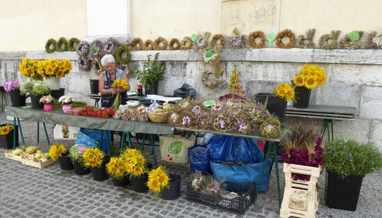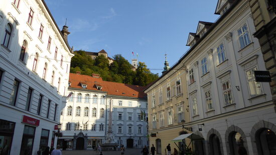 am zentralen Marktplatz mit den vom Architekten Plecnic erbauten ehemaligen Markt-/Fleischerbuden, jetzt als Restaurants und Cafés benützt, herrscht Trubel und Geschäftigkeit