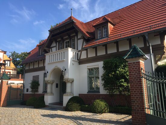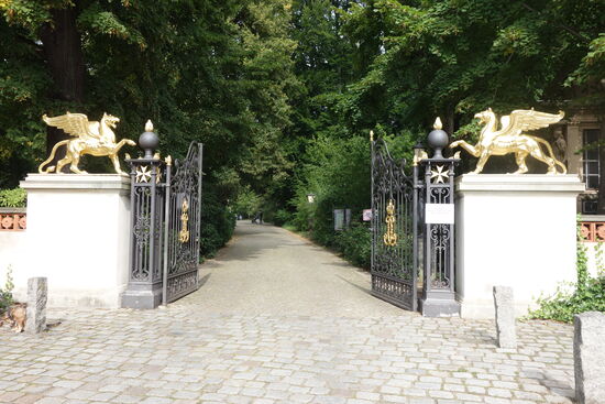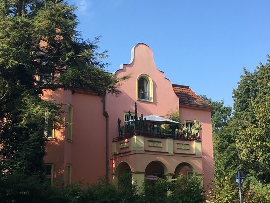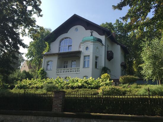 Bei schönem Wetter starten wir von unserem Quartier zu Fuß zum nahe gelegenen Griebnitzsee. Unser Ziel ist der Schloßpark Babelsberg. Da der Uferweg allerdings zeitweise unterbrochen ist wegen der Privatgrundstücke einzelner Villen, müssen wir manchmal auf die Straße wechseln. Das ist interessant, da sich dort zahlreiche Villen befinden.