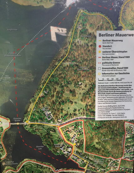 Am Ende des Uferweges kann man links in den Park Babelsberg abbiegen. Wir entscheiden uns jedoch zuvor rechts über die Brücke zu laufen und ein Stück dem Berliner Mauerweg zu folgen, der abenteuerliche Verläufe nimmt. .
