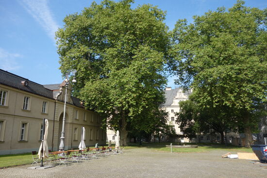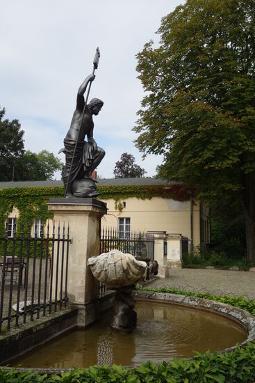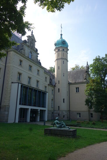 Entlang des ehenmaligen Todesstreifen können wir an einem abbruchreifen Tor in den Park eintreten. Dort stehen wir vor der Rückfront des Jagdschlosses, das für meine Begriffe mit einem 'unmöglichen modernen' Eingang versehen wurde - eine Todsünde der Denkmalpflege!.