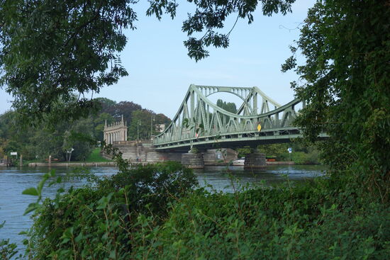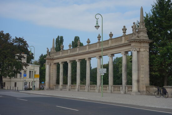 Ende des 17. Jh. Wurde eine erste Holzbrücke an dieser Stelle gebaut, um eine Verbindung zwischen den Potsdamer Schlössern und den Jagdgründen auf der anderen Havelseite zu schaffen. 1754 wurde die Brücke für den Postkutschenverkehr geöffnet und 1777 mit einer hölzernen Zugbrücke und Wachhäuschen versehen. Um den stark zunehmenden Verkehr bewältigen zu können, baute man nach Plänen des preußischen Hofarchitekten Karl Friedrich Schinkel 1832 bis 1834 eine Steinbrücke. Mit der Eröffnung des Teltowkanals 1906 und dem Beginn des motorisierten Verkehrs wurde es dringend notwendig, die Zugbrücke zu ersetzen. Trotz Protesten wurde die Backsteinbrücke abgerissen und mit dem Neubau einer Straßenbrücke begonnen. Ihren heutigen Namen verdankt die 1907 eingeweihte Brücke dem in der Nähe gelegenen ehemaligen Gut Klein Glienicke. Die Kolonnaden entstanden als Bestandteil des Brückenneubaus im neobarocken Stil. Architekt war Eduard August Wilhelm Fürstenau (1862 -1938). Den plastischen Schmuck schuf der Bildhauer Stephan Walter (1871 - 1937). Für den Bau verwendete man Wünschelburger Sandstein aus einem Gebiet im heutigen Polen. Dieser Sandstein hat sich als äußerst qualitätsvolles Baumaterial von hoher Verwitterungsbeständigkeit erwiesen. Nach der Zerstörung der Brücke im 2. Weltkrieg begann 1947 der Wiederaufbau. Die eingestürzte Stahlkonstruktion wurde gehoben und wieder eingefügt. Die bis zum 3. Juli 1953 freigegebene Brücke wurde nun für Zivilpersonen gesperrt. Auf der Brückenmitte befand sich die Grenze zwischen Ost und West. Von 1962 bis 1986 kam es auf der Glienicker Brücke zum Austausch von Agenten.