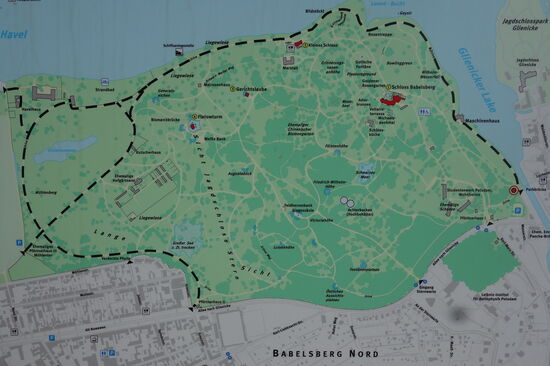 An der Brücke, wo wir nach rechts abgebogen sind, befindet sich auch ein Eingang zum Park Babelsberg. Wir werfen noch einen Blick zurück auf das am Ufer des Glienitzer Sees liegende Jagdschloss Glienicke und laufen am Seeufer entlang bis zur Maschinenhalle.