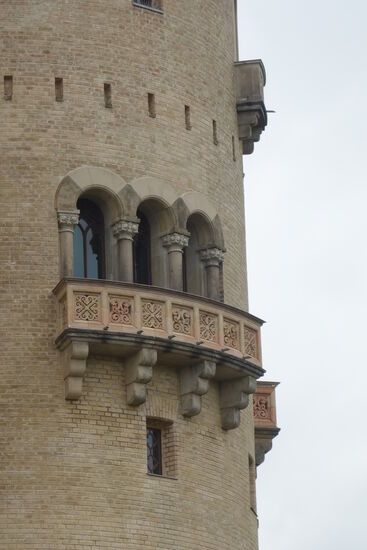 Dem neogotischen Belvedere wurde seitlich ein Burghaus angegliedert. Eine nicht mehr vorhandene Zugbrücke überspannte den um den Turm laufenden, sternförmigen Wassergraben. Ebenfalls nicht mehr vorhandene Kanonen auf Lafetten aus der Festung Rastatt und Standbilder von Landsknechten neben dem Eingang und einem Blumenrondell gaben dem Turm einen wehrhaften Charakter. Durch Vandalismus und Plünderungen nach 1945 kamen Möbel und Einrichtungsgegenstände abhanden.
