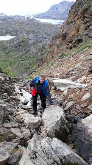 Dann sind wir nach 3 Stunden Aufstieg über schmale Trampelpfade, weglosen steinigen Passagen und unter wolkenlos blauem Himmel fast „on top“ auf einem breiten Grat! Ein fetter Steinmann heißt uns willkommen, dem Niklas ein weiteres Steinchen aufs Haupt legt. Die letzte Spitze der „Weiberkapuze“ – so die Übersetzung des Namens Nasaasaaq – haben wir ausgelassen. Nach dem überlangen Tag wegen der Zeitverschiebungen und bei den tropischen Witterungsbedingungen sind wir nun doch erschöpft und wollen mit der Kraxelei über Seilpassagen auf den letzten Pin nicht gleich am ersten Tag irgendwelche Risiken eingehen.