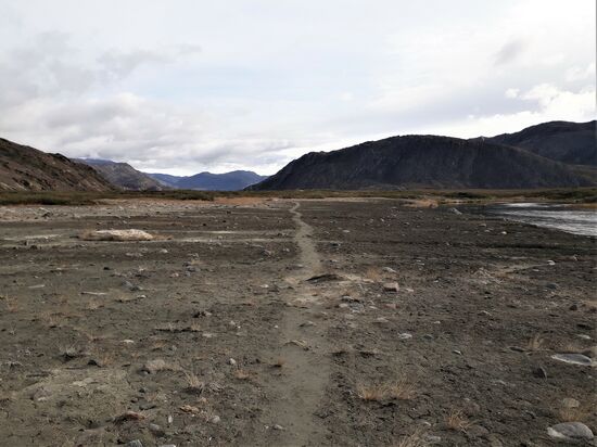 Zwischen Fluss und Aufstieg aus dem Tal verzeichnet die Karte ein großes zusammenhängendes Sumpfgebiet und wir richten uns mental schon auf weitere 2 km Wassertreten ein. Allein, es kommt komplett anders. Die restliche Wegstrecke bis zur talbegrenzenden Bergwand ist fast knochentrocken und total eben. Es folgt unbeschwertes Gehen unter blauem Himmel bei angenehmen Temperaturen und lauem Wind.
