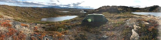 Es gibt hier tolle Panoramen auf unzählige Bergseen und wir beschließen, nicht mehr bis in die Nähe der Ikkattooq-Hütte zu laufen. Vor dem letzten Grat rüber ins nächste Tal finden wir einen schönen Platz oberhalb eines kleinen Sees in idyllischer, sonnendurchtränkter Umgebung. Der Blick ist weit und unverbaut. Die heute erbrachte Höchstleistung wird durch eine behördlich genehmigte kulinarische Ausschweifung belohnt: Penne Bolo und anschließend Fette Brühe mit Markklößchen.