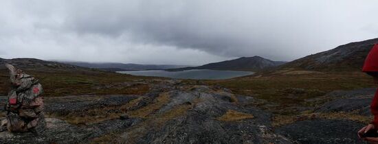 Die Witterung ist ungemütlicher geworden. Leichter Nieselregen verleiht allem und jedem eine glänzende Oberfläche. Im weiteren Verlauf zieht sich der Pfad über steinige 5 km kaum merklich bergan. Dann stehen wir am Rande des Seen-Plateaus und blicken von der 300-m-Höhenmarke auf den großen, langgezogenen See Tasersuaq. An dieser Stelle hatte ich ursprünglich ein Etappenende geplant und schon in die Karte eingezeichnet. Da das Wetter sich weiter verschlechtert hat und noch genügend Kraftreserven vorhanden sind, ignorieren wir die Planung und marschieren weiter. Der Tasersuaq ist über 30 km lang und ziemlich gleichförmig zwischen ein und zwei km breit. Nur an einer Stelle besitzt er eine Ausstülpung – an seinem Südufer – die wie ein 2x3 km großes Geschwür quasi einen eigenständigen kleinen See bildet, nur durch eine schmale Wassergasse mit dem Muttersee verbunden. Er hat auch einen eigenen Namen: Kangerluatsiarsuaq.