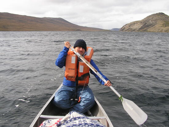 Wir nähern uns einem Inselchen und beschließen, dort anzulegen und uns ein wenig die Beine zu vertreten. Von der 194 m hohen Erhebung erhoffen wir uns einen Blick auf das heutige Tagesziel: die Katiffik-Hütte am OstEnde des Sees. Sicher vertäut überlassen wir die TINU sich selbst und erklimmen die „Höhe 194“. Der Blick auf die Hütte wird uns vom steilen Nordufer verwehrt, an dem wir nicht vorbeigucken können. Immerhin zeigt ein 10 Kilometer weiter Blick zurück über den See, welche Strecke wir schon auf dem Wasser zurückgelegt haben. Die Hälfte ist geschafft. Wir lassen uns noch etwas durchpusten und drehen die Nasen aus dem Wind. Schön ist es hier oben im Wind. Ich bin froh und dankbar, dass ich hier sein darf. Der Wind braust in meinen Ohren, während ich das Naturschauspiel rings um mich her bewundere und ein Gefühl tiefer Zufriedenheit erfüllt mich.