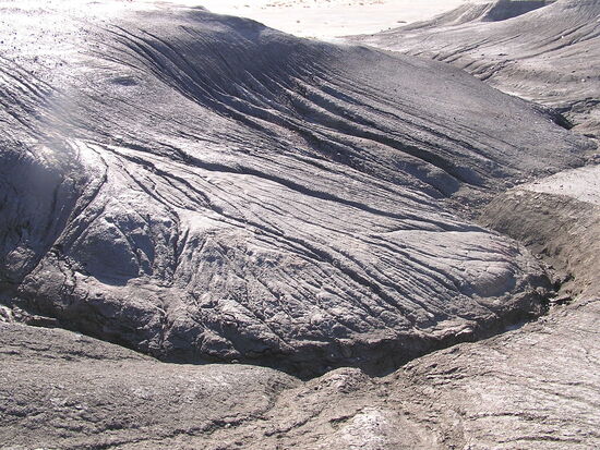 Wir folgen der Straße stadtauswärts Richtung Kelly Ville und biegen irgendwann etwa auf Höhe der halben Landebahn links auf eine Schotterpiste mit Namen Tulugaq ab. Wenn man sich jetzt halblinks hält, läuft man geradewegs auf ein hügeliges, lehmiges Labyrinth aus Sandstein und Ton zu. Die Oberfläche über dem ganzen ist zwar eben wie ein Brett, allerdings ist die gesamte Fläche durchzogen von 2-5 m hohen Gräben und Rinnen. Der Boden ist lehmartig und haftet hervorragend an den Schuhsohlen. Binnen kurzem ist man um mindestens 10 cm gewachsen und die Füße sind schwer wie sonst was.