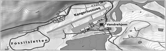 Heute gibt’s kein großartiges Programm. Es ist wieder ziemlich warm, was den Unternehmungsgeist nachhaltig in träge Stimmung versetzt. Außerhalb von Kangerlussuaq, am Ende der Landebahn, quasi direkt hinter den Leuchtfeuern, liegt Fossilsletten. Zwischen Ort und Fjord breitet sich eine etwa 2 km lange zementgraue Fläche aus. Hier soll man – wie der Name vermuten lässt – Fossilien finden können. Ein bißchen was wollen wir schon unternehmen und nicht nur auf der faulen, knitterigen Haut liegen – aber möglichst anstrengungsfrei. Da bietet sich ein Spaziergang zur Fossilienstätte geradezu an.