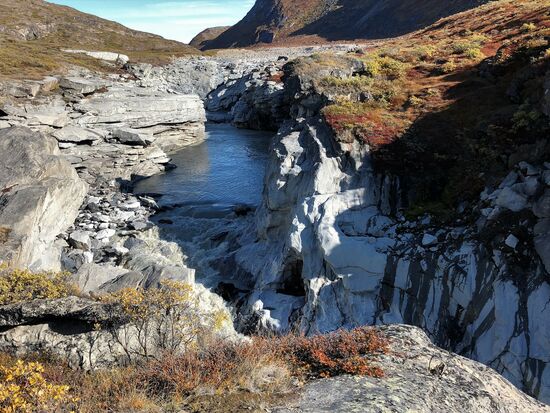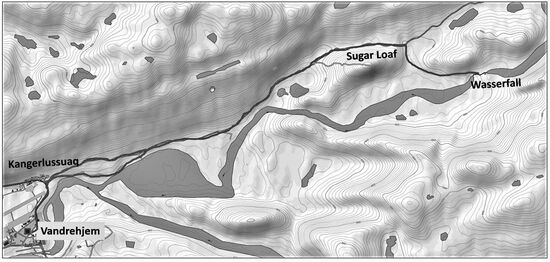Nach weiteren 7 km erreichen wir den Abzweig, der zum Wasserfall führt. Fahrradfahren mit dicken Wanderschuhen ist nicht der Brüller. Mir schmerzen nach den 11 km vom Fahrradverleih bis hierher die Füße. Da der Weg angenehm zu begehen scheint, werden die Räder sorgsam am Straßenrand abgelegt und der Rest per pedes erledigt. Wir befinden uns, an dessen kurzer Ostseite wir uns einen halben Kilometer lang erfreuen können. An der östlichsten Ecke des Sugar Loaf beschreibt der Weg eine langgezogene Linkskurve um einen Nachbarhügel herum bis der Akuliarusiarsuup Kuua, der Schmelzwasserabfluss aus dem Inlandeis, Einblick in den Canyon gewährt, den er hier an seiner engsten Stelle in langen Jahrtausenden herausgewaschen hat. Nach etwa 300–400 m, die man oberhalb der senkrechten Abbruchkante des Canyons auf der rechten Fluss-Seite zurücklegen muss, erreichen wir den sogenannten Wasserfall, namentlich: Elvfossen.