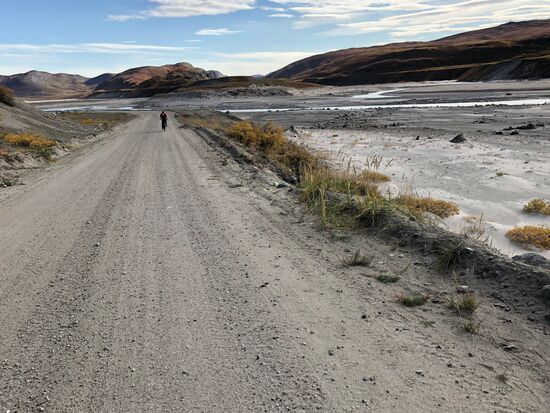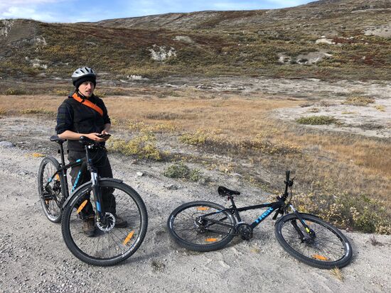 Helme auf, Hintern auf den Sattel und die Haxen mit den Bergschuhen auf die Pedalen. Man kann nicht meckern: die Räder sind nicht alt oder schrottig, sondern wirklich in Ordnung. Die 21 Gänge funktionieren und Luft ist genug in den Reifen. Die Schotterpiste ist alles andere als eben. Es sind regelmäßig kleinere Steigungen zu überwinden, was durch den teilweise doch nicht festgefahren Schotter erschwert wird. Nach 2 km taucht eine Stange mit einem gelben Fähnchen mit aufgedruckter Nummer 17 im Gelände zur Linken auf. Der nördlichste 18-Loch-Golfplatz der Welt, der eigentlich ein einziger Sandbunker ist, zeigt uns ein typisches „Grün“: eine etwa 40x40 cm große grüne Filzplatte, in deren mittig angebrachtes Loch geputtet werden kann.