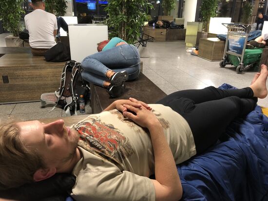 Der Flug bis Kopenhagen verläuft ohne Zwischenfälle. Keine Luftlöcher, Turbulenzen oder durchs Triebwerk angesaugte Flugsaurier – nichts von alledem. In der Ankunftshalle nehmen wir sofort zwei freie Liegeplätze auf den Holzquadern in Beschlag. Lernfähig wie wir sind, haben wir sowohl die Isomatten als auch die Schlafsäcke ins Handgepäck getan und können nun völlig entspannt der Dinge harren, die bis morgen Nach-mittag kommen mögen. Gleich gegenüber ist der 7-Eleven-Kiosk, dessen reichhaltiges Sortiment uns auf dem Hinflug schon verführt hatte.