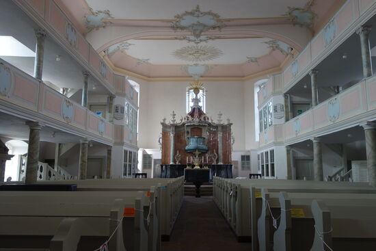 Der als Saalkirche angelegte Kirchenraum entspricht dem einer Predigtkirche. Er ist auf drei Seiten von zweigeschossigen Emporen umgeben, die unten auf toskanischen und oben auf ionischen Holzsäulen aufliegen und im Chor auf beiden Seiten mit verglasten Patronatslogen abschließen.