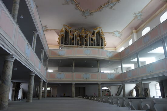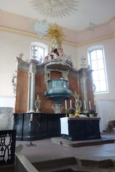 Den Altarraum prägt eine rot marmorierte Kanzelwand aus Stuckmarmor auf schwarz marmoriertem Sockel und seitlichen Säulen mit korinthisierenden Kapitellen. Ihr geschweiftes Gebälk ist mit Rocaillen und Schmuckelementen im Stil des Rokoko besetzt. In der Mitte thront ein ausladender, dunkler Kanzelkorb mit einer Kanzeluhr unter einem drapierten Baldachin, bekrönt vom hebräisch geschriebenen Gottesnamen JHWH in einem goldenen Strahlenkranz.