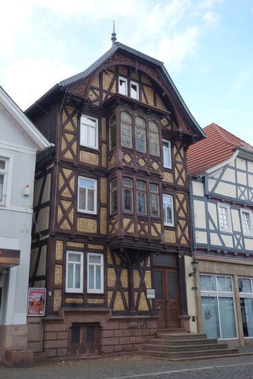 Nach Verlassen des Burghofes gelangen wir an den Platz der Kirche; das Fachwerkhaus, auf das wir zulaufen, ist das Geburtshaus von Adolf Spieß, dem Hauptförderer des deutschen Schulsports. (Tafel am Haus)