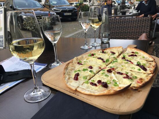 Bevor wir durch das 'imaginäre' Türmertor die Stadt verlassen , stärken wir uns mit einem Camembert-Flammkuchen und einem Glas Wein in einer (ausnahmsweise geöffneten) Lokalität.