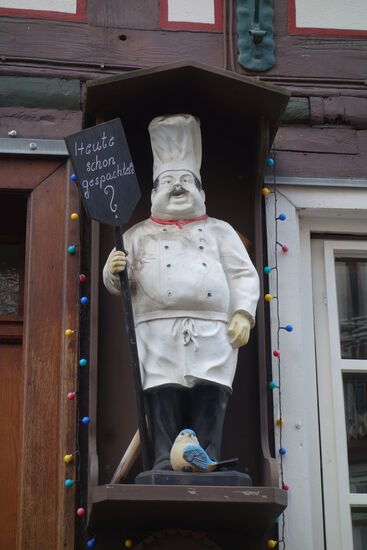 Von der Kirche gelangen wir zum Marktplatz, einem hübschen Ensemble von Fachwerkhäusern. Von dem dort einmal vorhandenen Türmertor ist nur noch eine Tafel mit einer Abbildung zu sehen, wo es einmal gestanden haben kann. Auch die beschriebene Türmerstube können wir coronabedingt nicht besuchen.