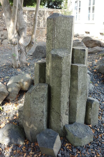 Basalt wurde früher vor allem wegen seiner Härte und Widerstandsfähigkeit gerne als Pflaster-, Rand-und Baustein verarbeitet. Basaltsäulen, wie hier diese kleinen Exemplare waren vor noch nicht einmal ganz 100 Jahren ein wahrer Exportschlager dieser Region. So wurden z. B. bei der Eindeichung des "Ijsselmeeres" (Niederlande) große Mengen an Basaltsäulen aus einem Lauterbacher Steinbruch verbaut. Diese waren sehr begehrt, da sie mit einer Länge von über 10 Metern unbeschädigt gebrochen werden konnten.