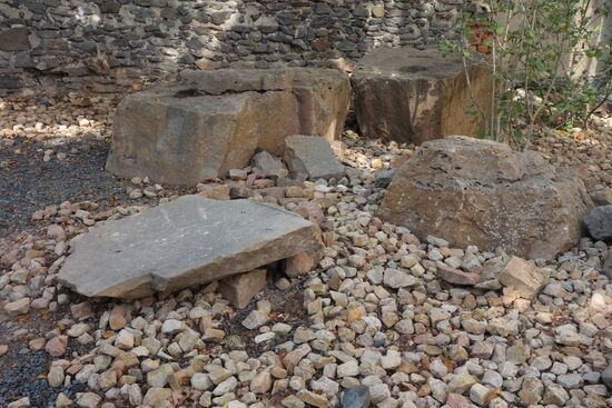 Im kleinen Park des Schlosses findet sich in einer Ecke eine kleine Aussetllung zu den im Vogelbergkreis vorkommenden Gesteinen vulkanishen Ursprungs. Hier finden wir auch den Hinweis zu dem Besuch des Vulcaneums in Schotten und zum Steinbruch Michelnau.