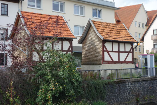 Auf em Rückweg fallen uns noch zwei winzige Häuser am Flussufer der Lauter auf: Es handelt sich um alte Ställe aus dem 18. Jh, in denen damals vor allem Schweine und Ziegen gehalten wurden - im oberen Teil wurde das Brennholz gelagert.