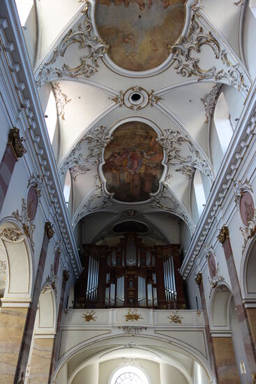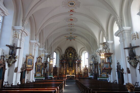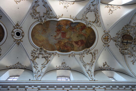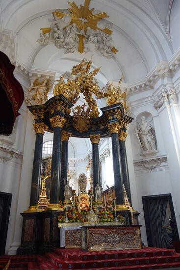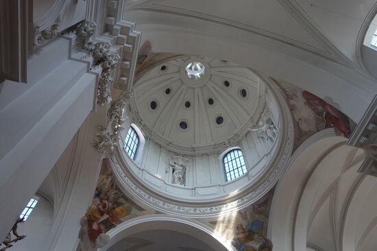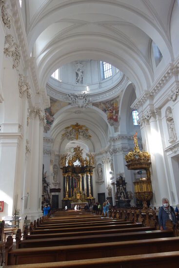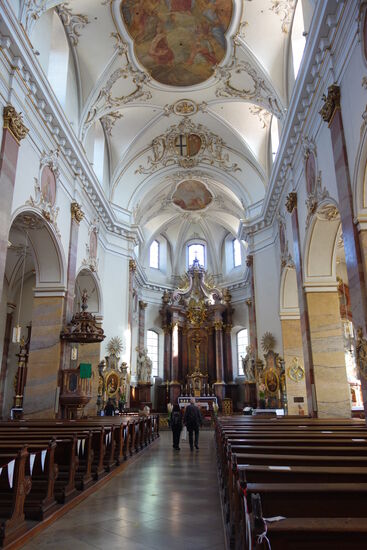 Der weiß getönte Innenraum greift Elemente des Petersdoms in Rom und der Lateransbasilika auf. Die prächtige Innenausstattung zeigt Einfluss des römischen Barock und ist laut Georg Dehio „dem Besten der Epoche zuzuzählen“. Die Raumwirkung wird von dem Kontrast zwischen dem Weiß der Mauerflächen und der Stuckierung zum einen und dem schwarz-goldenen Farbakkord der architektonischen Elemente und der Ausstattung zum anderen bestimmt.
