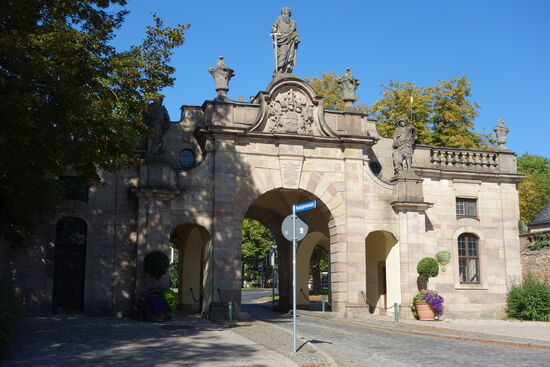 Am Ende der Pauluspromenade steht das Paulustor von 1771, durch das wir in die Stadt gekommen sind. Für die Toranlage des Paulustor zeichnete auch Johann Dientzenhofer verantwortlich. Benannt ist das barocke Bauwerk nach dem Apostel Paulus, dessen Statue in der Mitte über dem Portal steht, umrahmt von den beiden Stadtheiligen Simplizius und Faustinus.