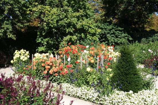 Wir haben bei der Vorbereitung usneres Rundganges von einem Dahliengarten gehört, den wir nun (auf)suchen. Verborgen hinter hohen Mauern entdecken wir den farbenprächtigen Sommergarten mitten im Herzen der Stadt Fulda. Dieser Themengarten wurde 1994 im Rahmen der 1. Hessischen Landesgartenschau von Oberbürgermeister a. D. Dr. Wolfgang Hamberger und dem damaligen Gartenamtsleiter Rudolf Theuer geplant und der Dahlie gewidmet. Über 30 verschiedene Dahliensorten entfalten hier bis in den Spätsommer einen wahren Farbenrausch wobei sie ihre zum Teil extravaganten Formen gut in Szene setzen