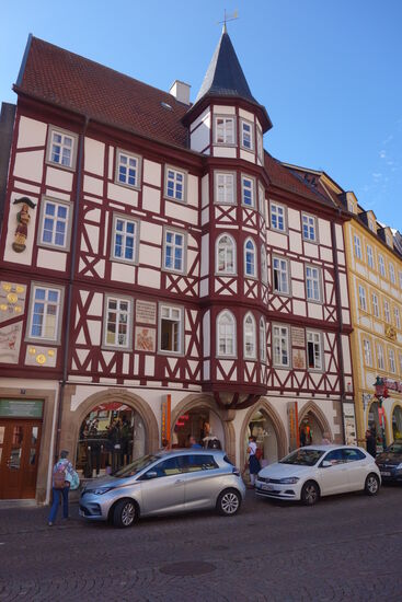 Am Platz der Kirche machen wir Kaffeepause und betrachten die retaurierten Geschäftshäuser, wie das Mollenhauerhaus von 1540. Es wurde als Kaufhaus und Gasthof genutzt und hatte auch Wohnungen adliger Beamter der Fuldischen Landesfürsten