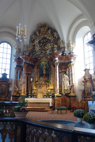 Der Bildhauer Johann Neudecker und der Stuckateur Giovanni Battista Artari haben gemeinsam das Bildwerk geschaffen. Am 15. August 1712 weihte Fürstabt Adalbert von Schleifras den Hochaltar, der in seiner Form als Baldachin an das Ziborium des Petersdoms und den Altar der Kirche Santa Trinità dei Monti in Rom angelehnt ist. Die schwarzen, marmornen Säulen des Altares enden in goldenen korinthischen Kapitellen und tragen goldene Voluten, die in einer Wolke mit Engeln enden. Diese wird wiederum von einer Marienfigur bekrönt. Hierbei handelt es sich um eine Darstellung der Himmelfahrt Mariens, die an der Decke von einer Dreifaltigkeitsgruppe aus Stuck empfangen wird. Zu besonderen Festtagen findet auf der Mensa des Altares der sogenannte "Silberne Altar" Platz, der die Schädeldecke des heiligen Bonifatius beherbergt.