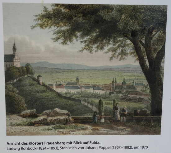 Etwa 80 Meter über der Fuldaaue erhebt sich der Frauenberg (330 m), der zusammen mit dem Rauschenberg im Osten (471 m) und dem Haimberg im Westen (410 m) die Stadtsilhouette prägt. Hier oben hat Bonifatius bei seinem ersten Aufenthalt in Fulda im Mai 744 die Fortschritte beim Klosterbau überwacht und sich auch zum Gebet zurückgezogen. Von den häufigen Aufenthalten des heiligen Bischofs rührt auch der erste Name des Berges als »Bischofsberg« her. Vielleicht wurde zu dieser Zeit schon eine Kapelle auf dem Berg errichtet. Sicher bezeugt ist der Bau einer Kirche und eines Klosters unter Abt Ratgar (reg. 802-817). Die Weihe dieser Anlage zu Ehren der Heiligen Gottesmutter erfolgte durch den Mainzer Erzbischof Richulf im Jahre 809. Durch das neue Patrozinium wandelte sich die Bezeichnung im Laufe des Mittelalters in »Marienberg« (Möns sanctae Mariae) und später in »Frauenberg«.