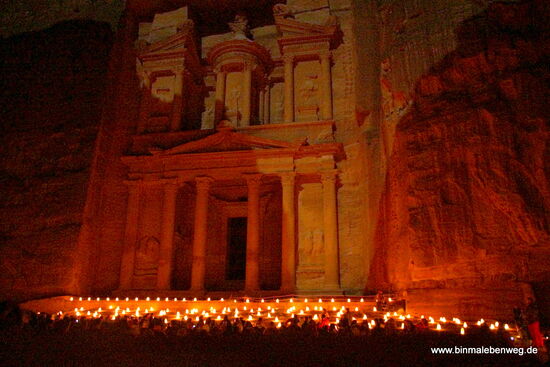 Der Weg geht durch eins schmale Schlucht, den Siq. Tausende von Kerzen markieren den Weg. Die Schlucht schlängelt sich durch das Gebirge. Es ist Vollmond, davon merkt man hier unten aber nichts. Die Felsen links und rechts sind dafür viel zu hoch. An verschiedenen Stellen sieht man noch die uralten Bewässerungsanlagen der Nabatäer. An anderen Stellen spürt man das Jahrtausende alte Kopfsteinpflaster.