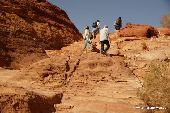 Mohammed, unser Guide, führt uns heute nicht durch den Siq. Vielmehr verlassen wir den Weg unmittelbar am Beginn des Siq beim Triclinium und kraxeln wie die Bergziegen linker Hand den Berg hoch.